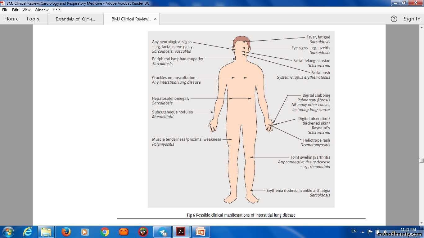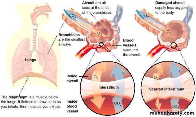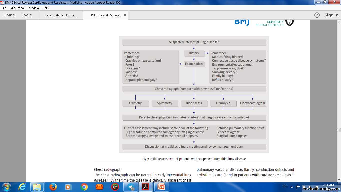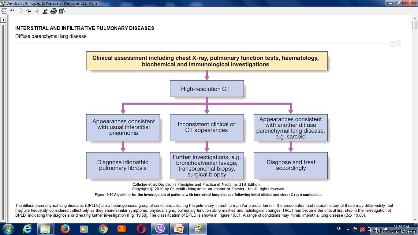 D/ABG :Hypoxemia & hypocapnia initially presents with exercise but later on at rest as the disease progressed.E/ Bronchoscopy & lung biopsy: only indicated in uncertain cases that cannot be diagnosed based on other tests.