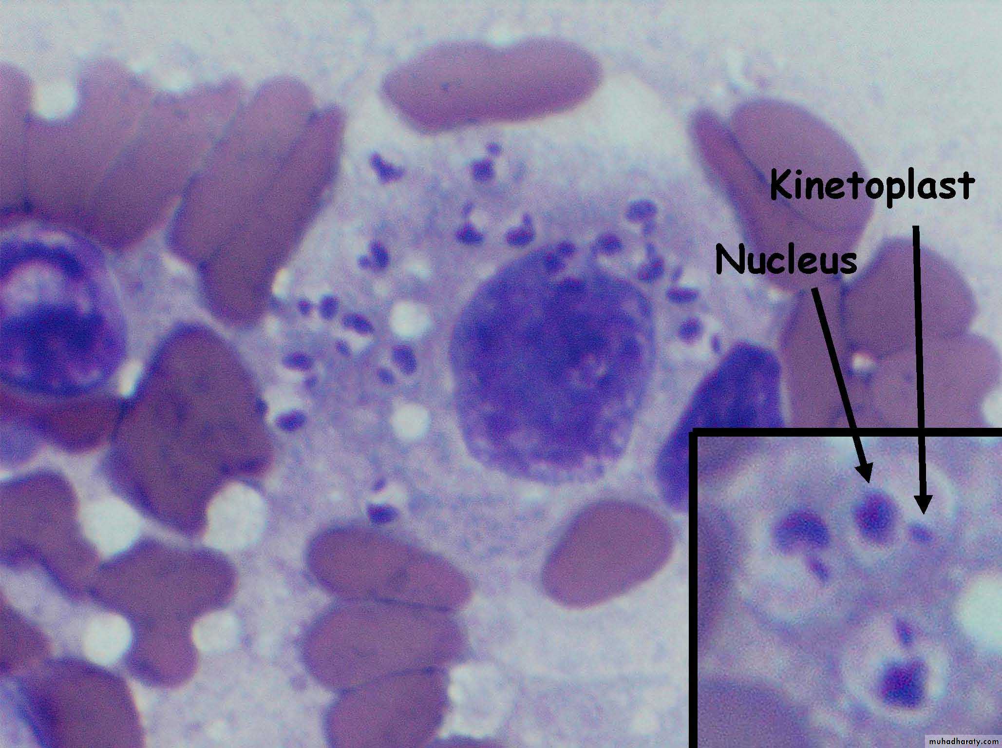 Leishmania: Amastigotes in a macrophage at 1000X, Inset shows the cell membrane and points out the nucleus and kinetoplast.