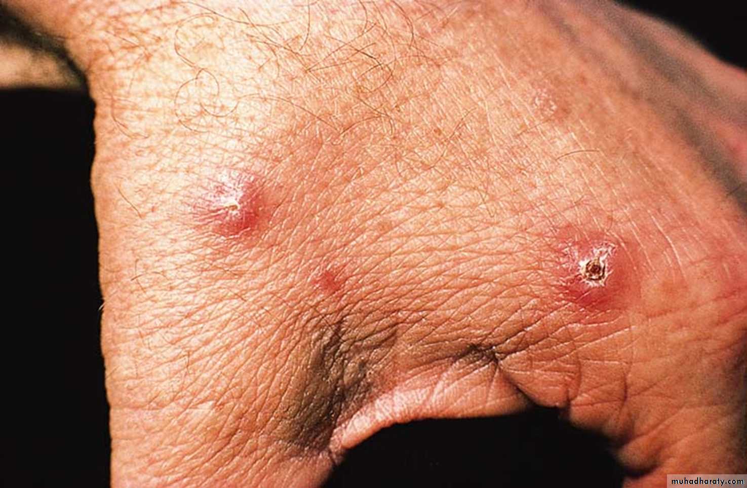 Following the bite, a papule develops, then rapidly enlarges and breaks down in the center. The ulcer usually has a rolled border (volcano sign) and it is asymptomatic unless secondarily infected.Cutaneous leishmaniasis due to Leishmania major: asymptomatic early papules, one of which is starting to show central crusting.