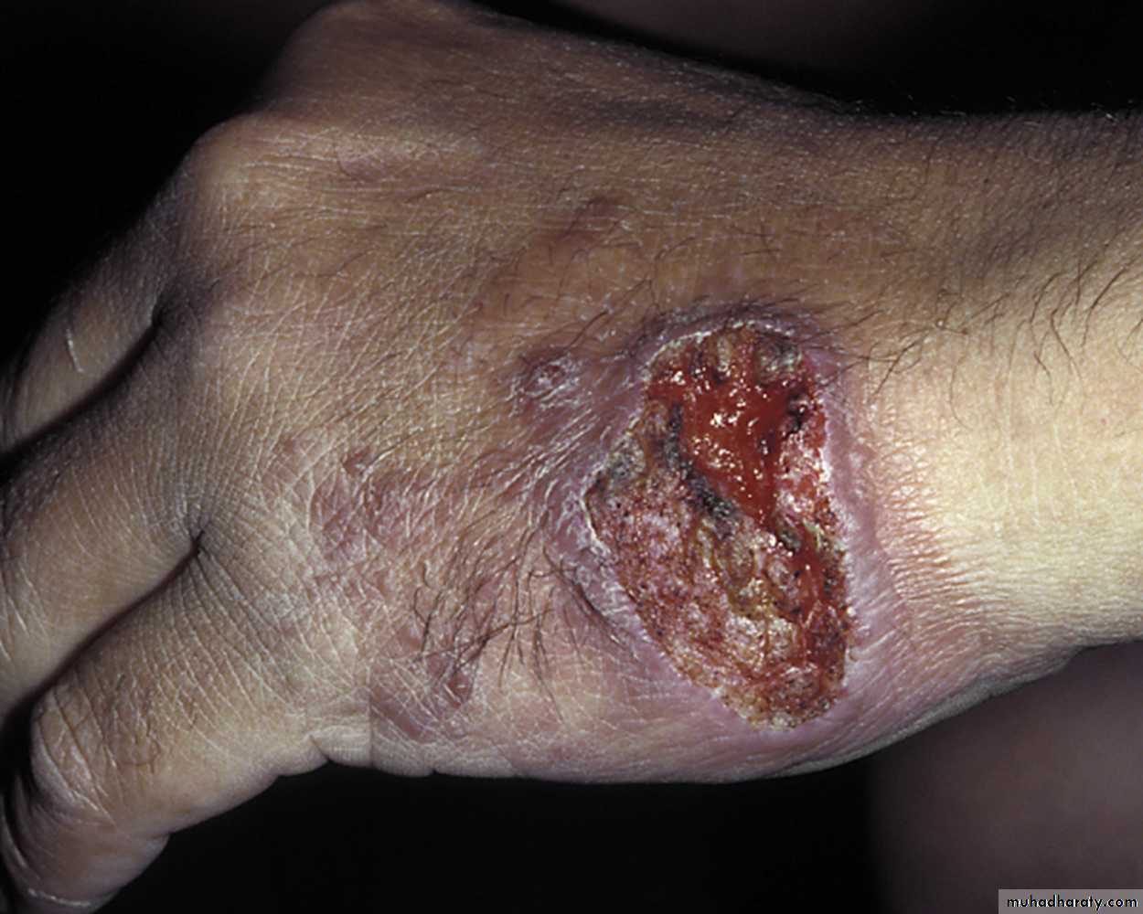 Cutaneous leishmaniasis. A red papule eventually ulcerates and forms raised edges with surrounding dusky red skin.
