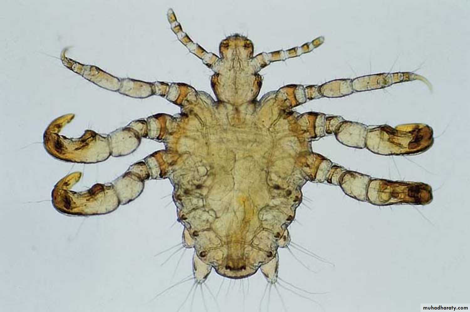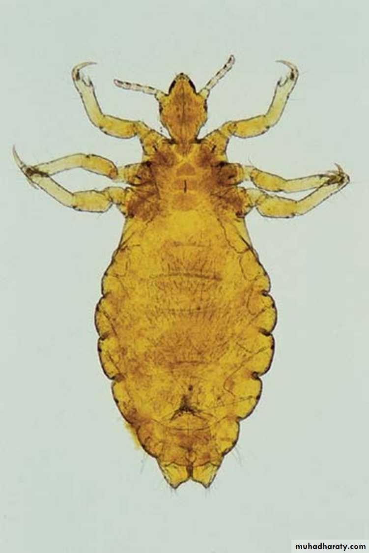 Head louse (Pediculus humanus var. capitis)Body louse (Pediculus humanus var. corporis)It is less than 2 mm, flat, wingless insect with three pairs of legs located on the anterior part of the body directly behind the head. The legs terminate in sharp claws.Body louse is the largest in size.