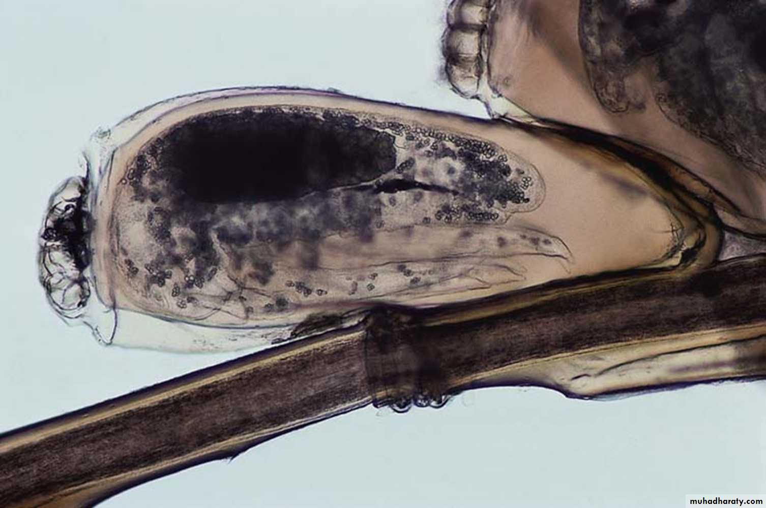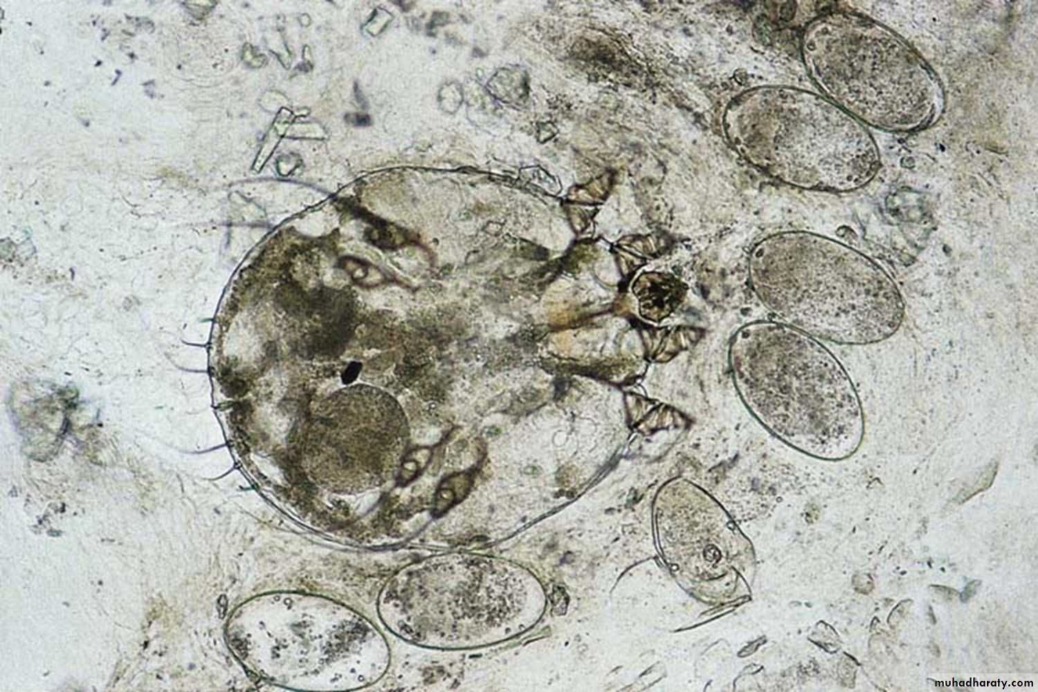 Sarcoptes scabiei: The scabies mite. Female with eggs. Ovoid body, flattened dorsoventrally; four pairs of legs, the anterior 2 pairs tipped with suckers.