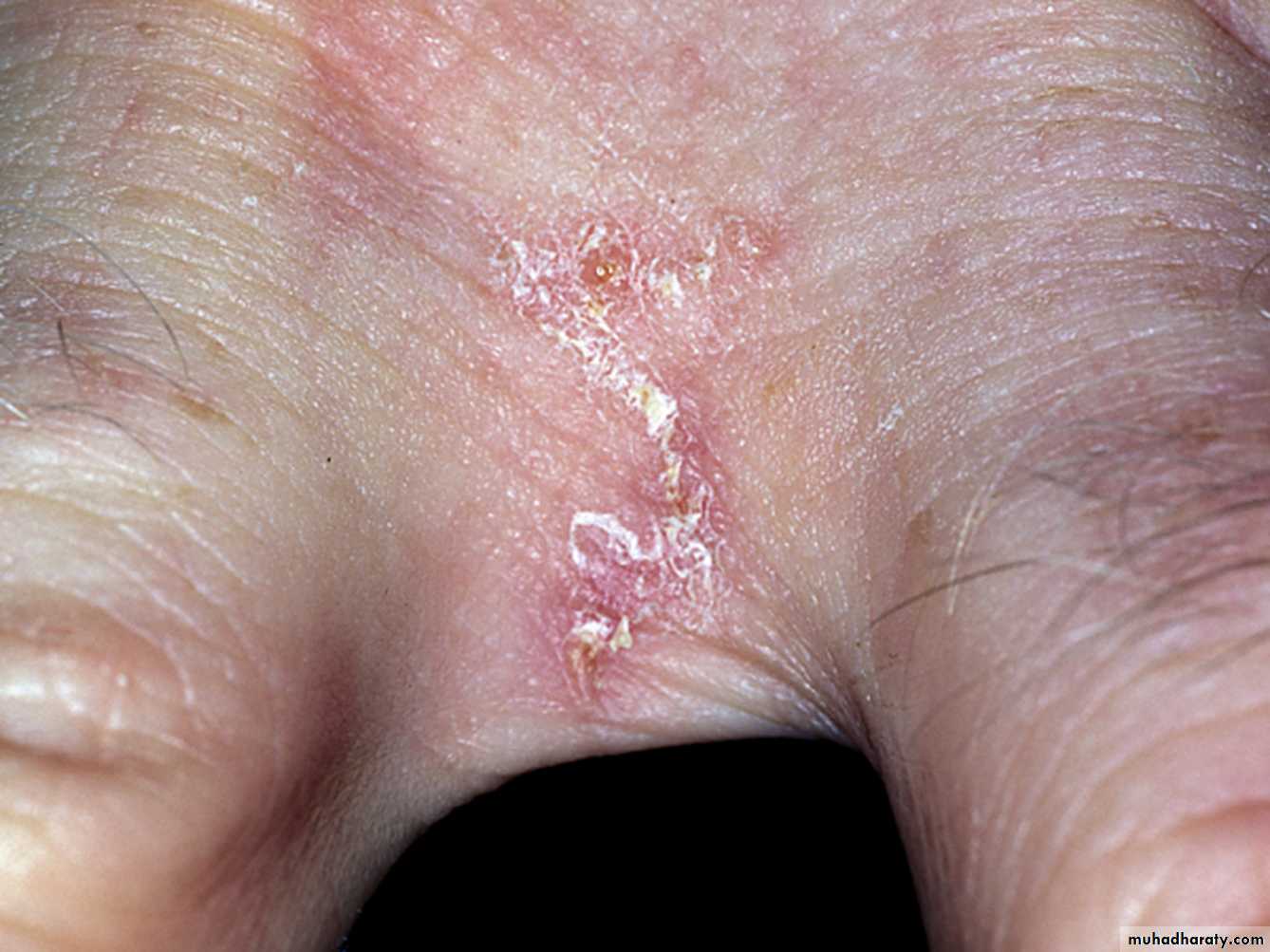 Burrows: Fine slightly raised, sometimes erythematous, irregular lines with a terminal swelling where the female mite can be found. Typical sites include interdigital spaces, sides of the hands and feet, flexural surface of the wrist, anterior axillary line, penis, nipples.