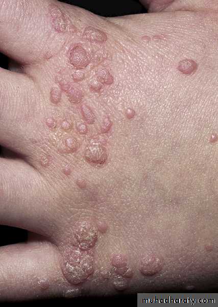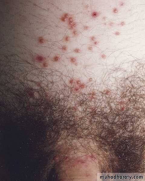 • Common sites of involvement are face in children and pubic area and genitals in adult.