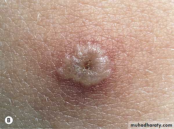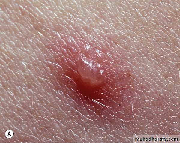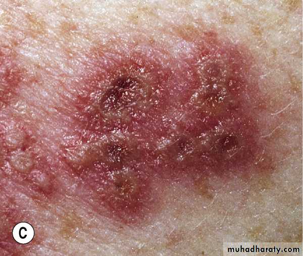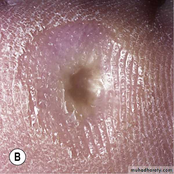 Chickenpox. Dewdrop on a rose petal”; a think-walled vesicle with clear fluid forms on a red base. B. The vesicle becomes cloudy and depressed in the center (umbilicated), the border is irregular (scalloped). C. A crust forms in the center and eventually replaces the remaining portion of the vesicle at the periphery.