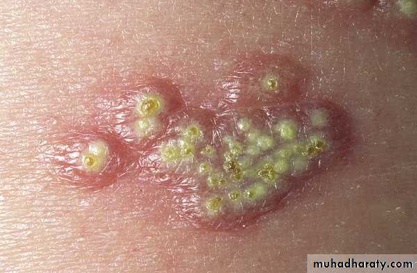 Primary herpes simplex. Vesicles on a red base are the primary lesions. Vesicles evolve to pustules and become umbilicated. Then, lesions dry and form discrete crusts.