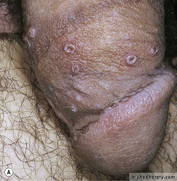 Genital herpes simplex. The primary lesion is a vesicle that rapidly becomes umbilicated. They are discrete.