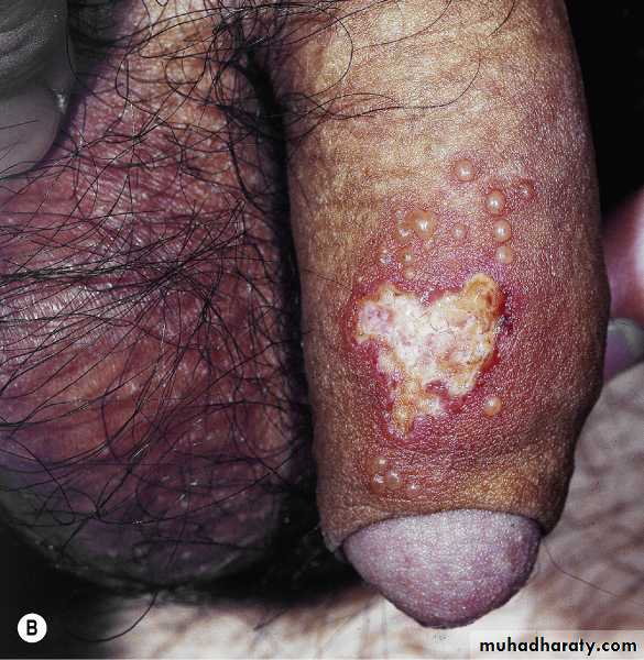 Genital herpes simplex. A group of vesicles has ruptured, leaving an erosion. Tense vesicles are at the periphery.