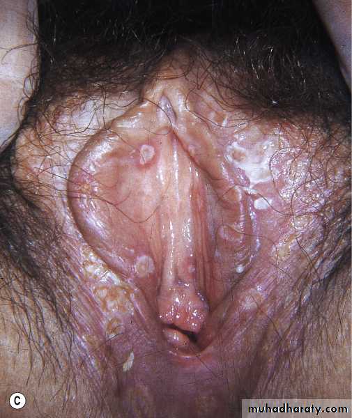 Genital herpes simplex. Scattered erosions covered with exudate.