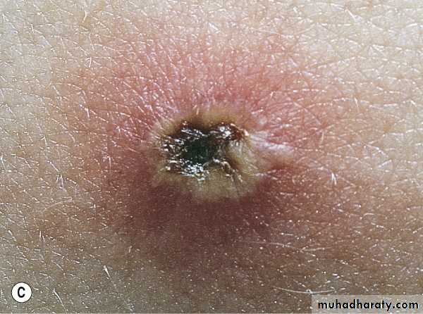 Chickenpox. A. Dewdrop on a rose petal”; a think-walled vesicle with clear fluid forms on a red base. B. The vesicle becomes cloudy and depressed in the center (umbilicated), the border is irregular (scalloped). C. A crust forms in the center and eventually replaces the remaining portion of the vesicle at the periphery.