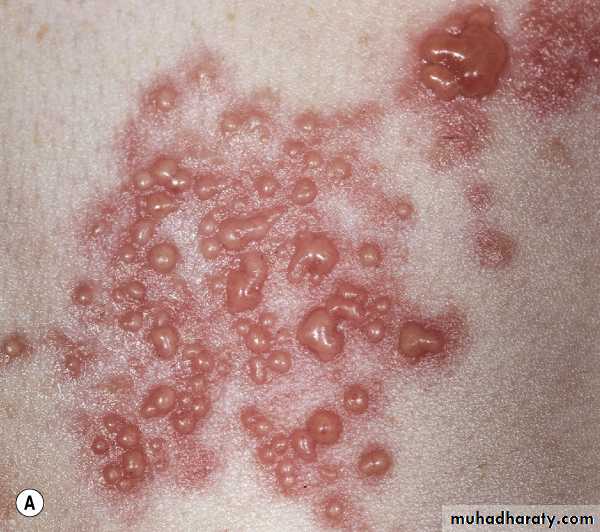 Herpes zoster. A group of vesicles that vary in size. Vesicles of herpes simplex are of uniform size. Vesicles become umbilicated and then form crusts. Confluent groups of vesicles in a highly inflamed case. Vesicles evolve to crusts and may eventually scar if inflammation is intense.