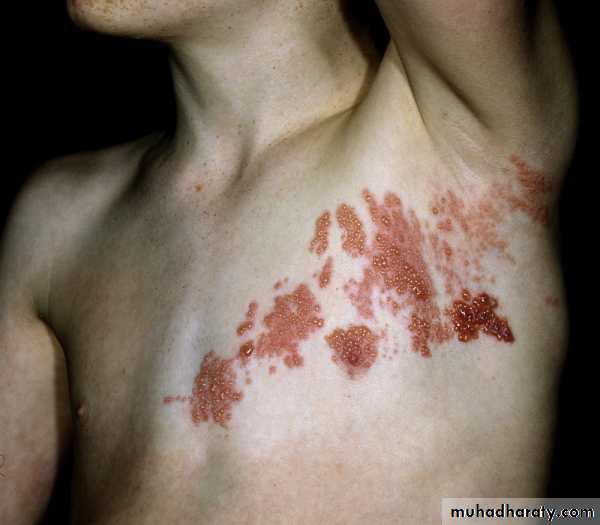 • Postherpetic neuralgia (PHN). It is the persistence of pain in affected dermatome after all lesions of herpes zoster have healed. PHN occurs especially in patients older than 50 years. Treated by gabapentine.
