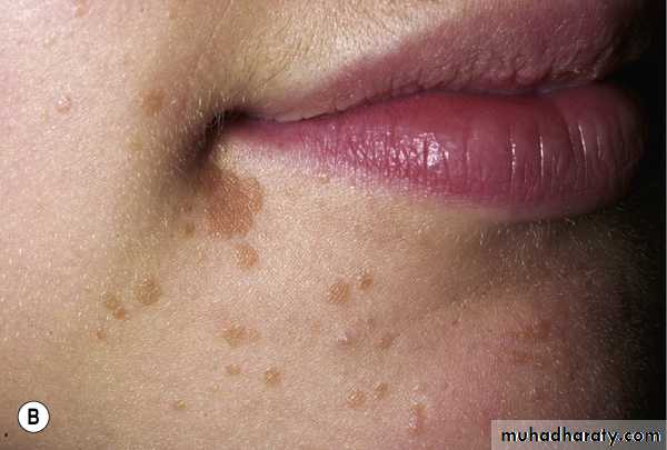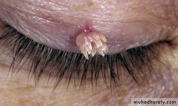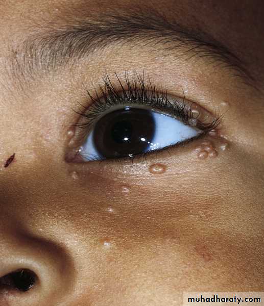 Molluscum contagiosum. Discrete, 2- to 5-mm, slightly umbilicated, flesh-colored, dome-shaped papules about the eye.