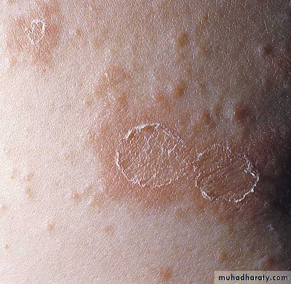 Pityriasis rosea. A ring of tissuelike scale (collarette scale) remains attached within the border of the plaque.