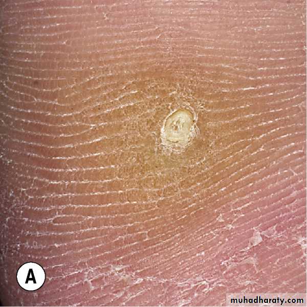 Corns. By paring, translucent white central core is revealed. While paring a wart lead to bleeding.