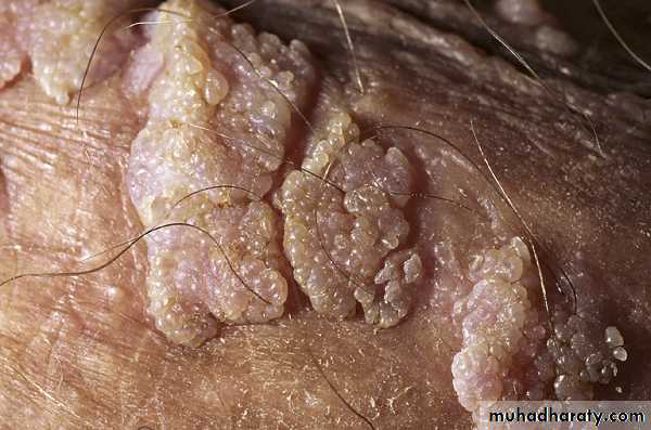 Genital warts (condylomata acuminata). Warts on the shaft of the penis have a papillomatous surface or projections and a very broad base.
