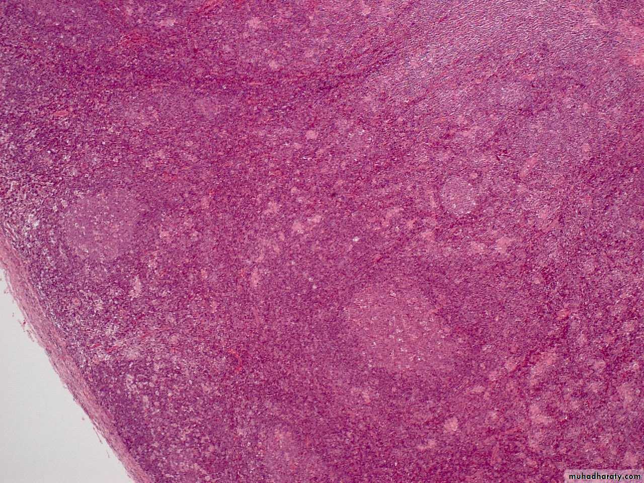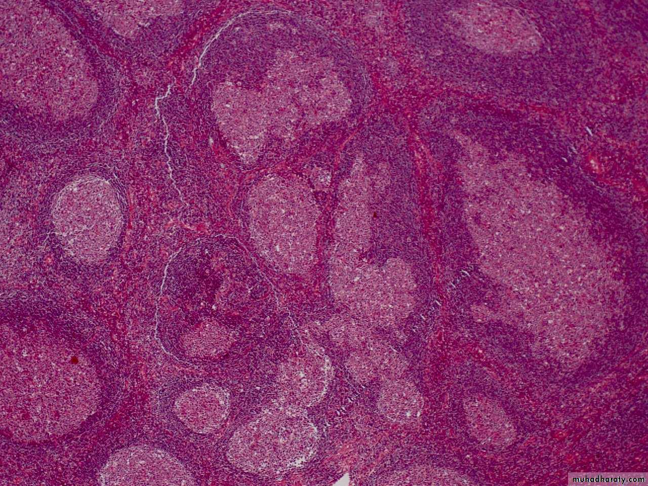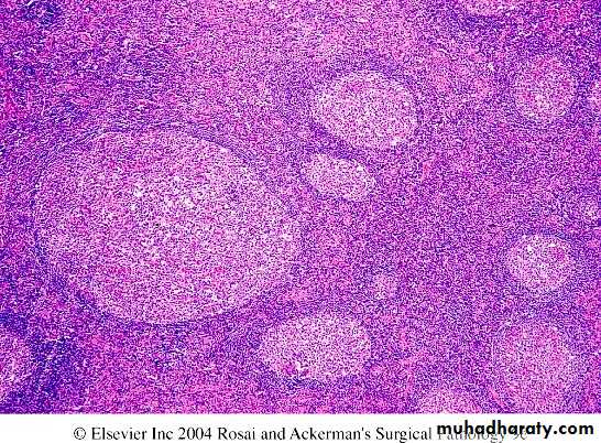 Follicular hyperplasia- increase in number and size of germinal centers, spread into paracortex, medullary areas