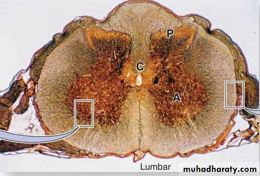 In cross sections of the spinal cord, white matter is peripheral and gray matter is internal and has the general shape of the letter H, in the center is an opening, the central canal which develops from the lumen of the embryonic neural tube. The canal is continuous with the ventricles of the brain, contains CSF, and is lined by ependymal cells. The gray matter forms the anterior horns, which contain motor neurons whose axons make up the ventral roots of spinal nerves, and the posterior horns, which receive sensory fibers from neurons in the spinal (dorsal root) ganglia. Spinal cord neurons are large and multipolar, especially the motor neurons in the anterior horns