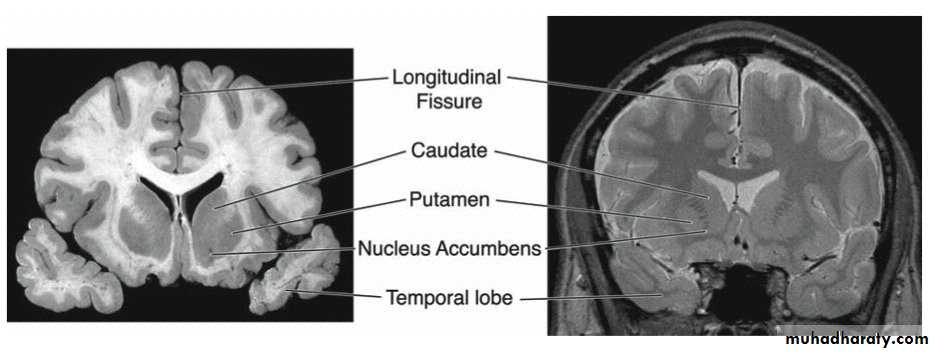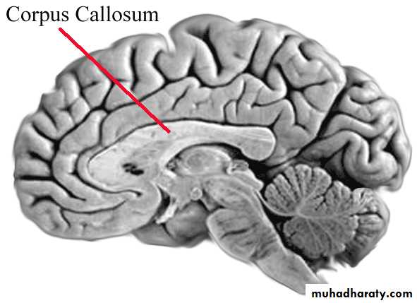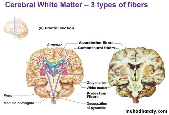 • Various sensory and motor tracts in the CNS and projection fibers.• Commissural fibers (connecting the two cerebral hemisphere), mainly: