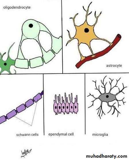 • Microglia are the main immune defence in the CNS, they originate from monocytes.• Ependymal cells line the brain ventricles and the spinal canal, they assist in the movement of CSF.