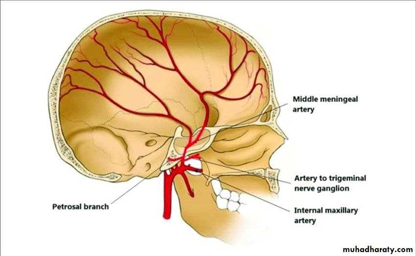 MMA arises from the maxillary artery in the infratemporal fossa. It enters the cranial cavity and runs forward and laterally in a groove on the upper surface of the squamous part of the temporal bone.