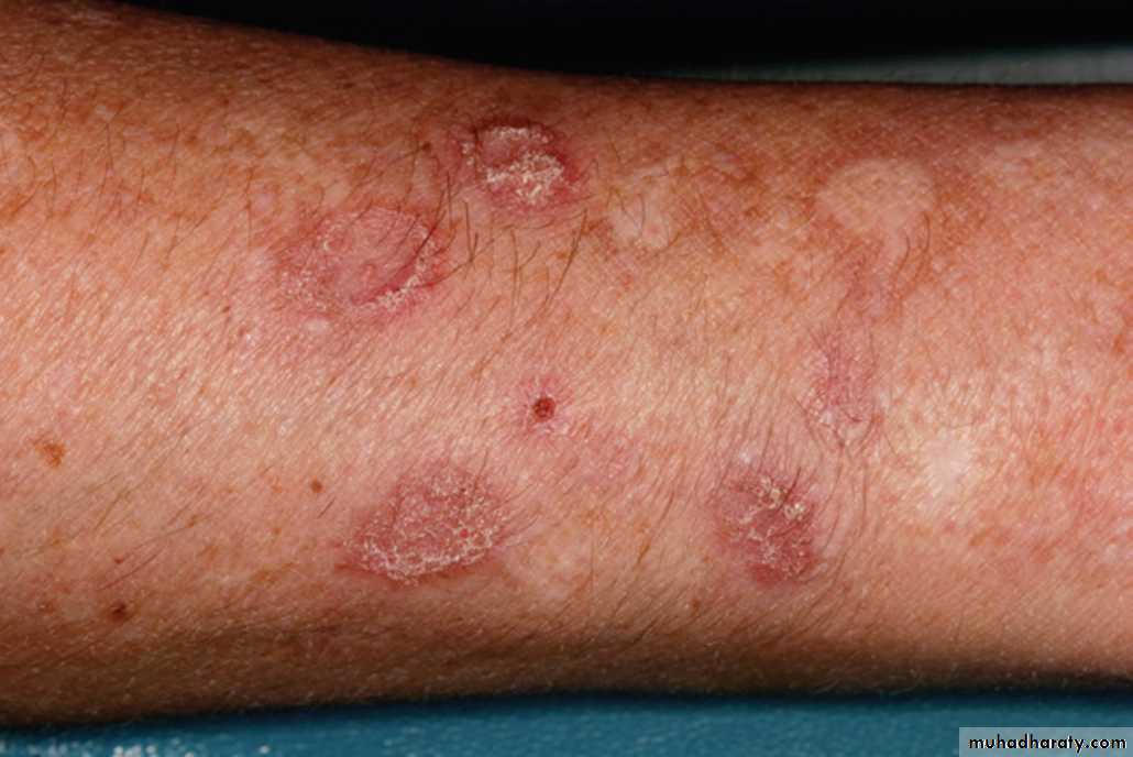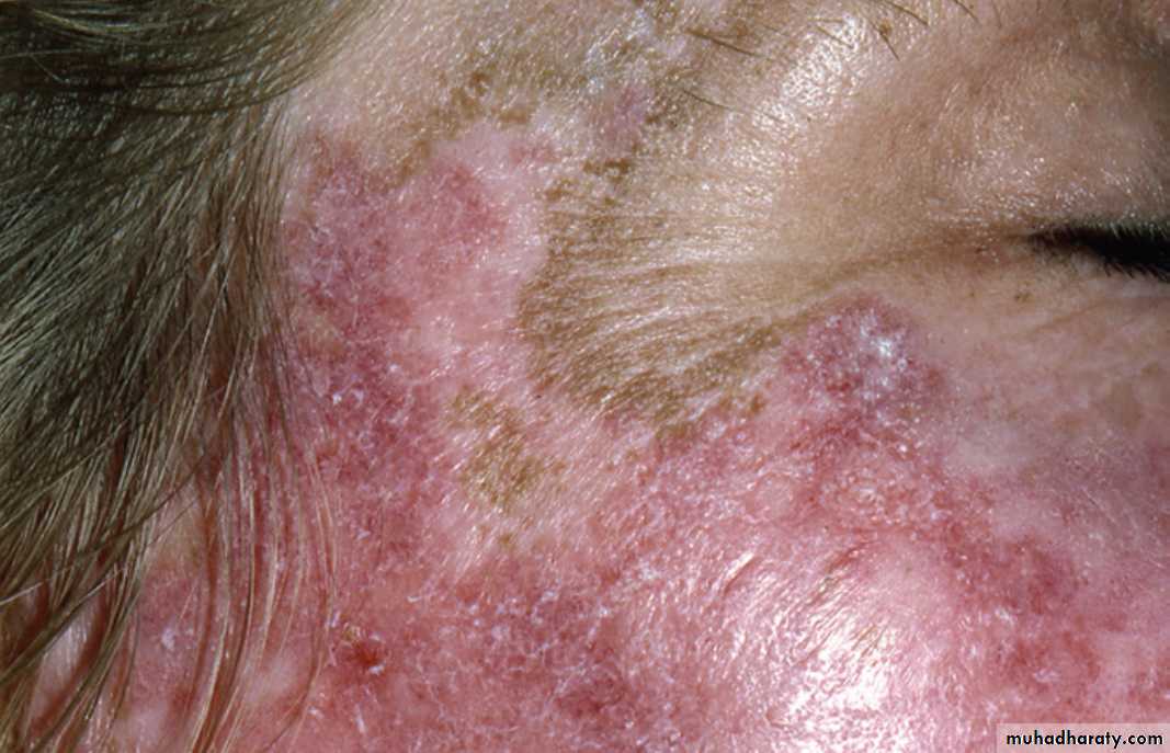 *The mildest form is called Discoid LE, it's chronic lesions confined to the sun exposed skin of the face scalp & ears, as well as oral mucosa*The intermediate form is called acute cutaneous LE, it’s widely spread & affects the head, neck, upper trunk & extensor surfaces of the arms