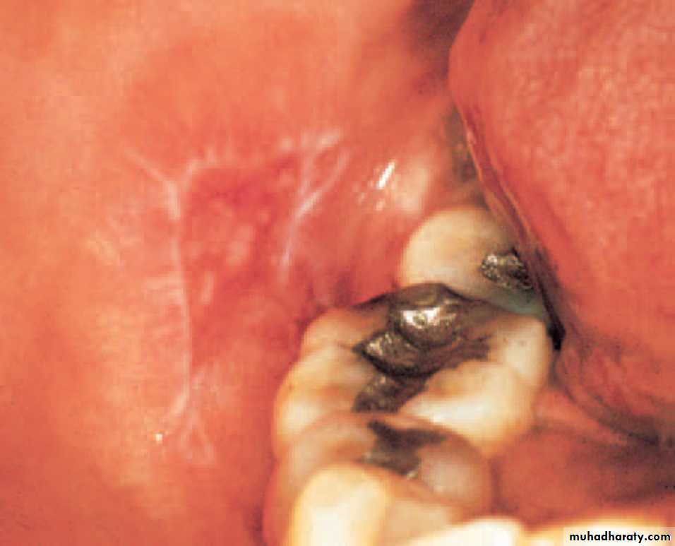 DLE. Radiating keratotic striae surrounding an erythematous zones of the buccal mucosa. These features are similar to those of erosive lichen planus•