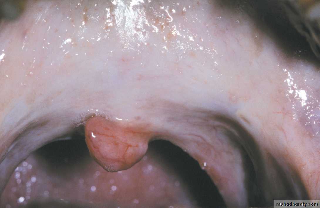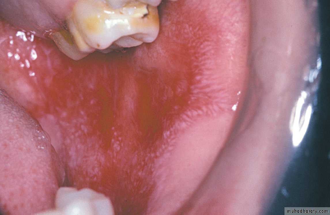 Intra oral skin graft. A skin graft placed on the right posterior hard palate appears as a scar-like, pale patch•