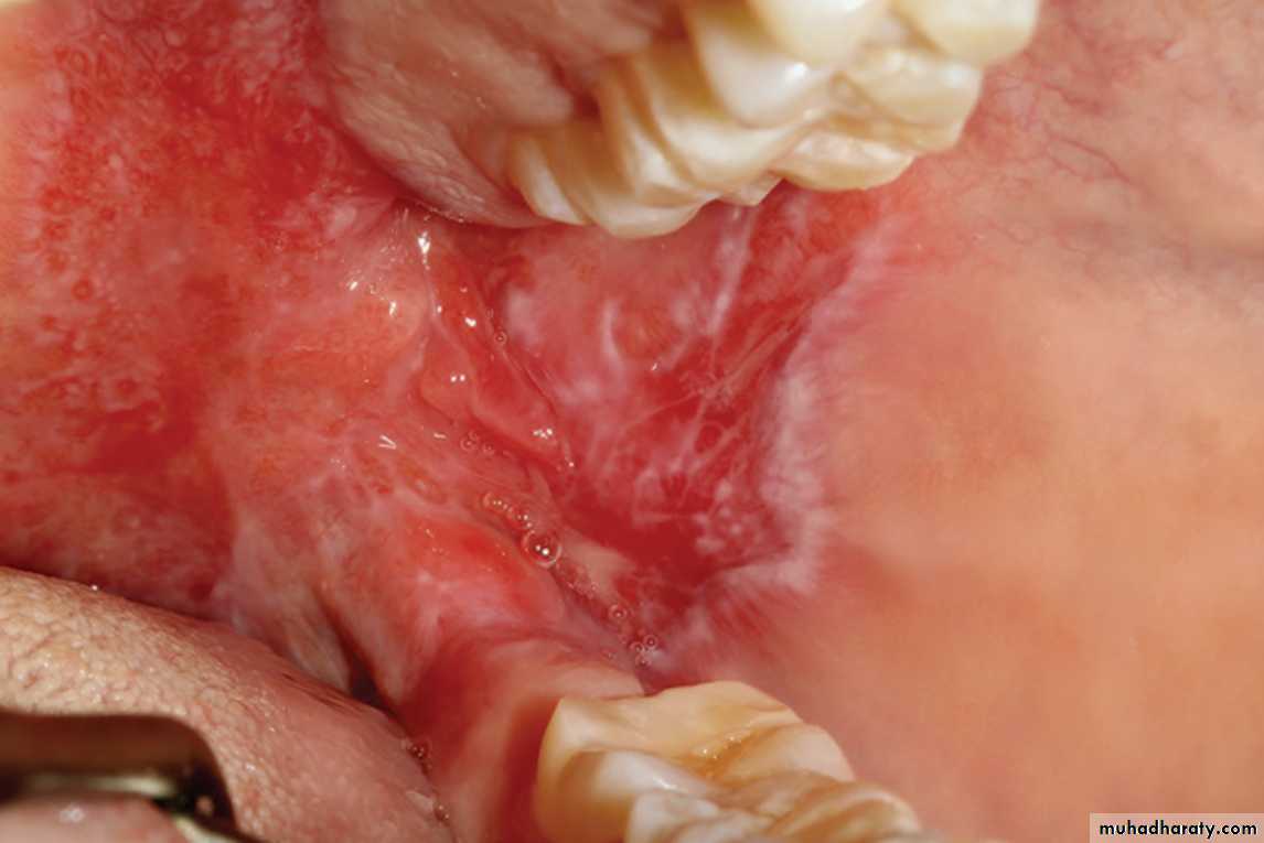 SLE. This ulceration of the buccal mucosa exhibits fine radiating white striae at its periphery, clinically appearing similar to erosive lichen planus