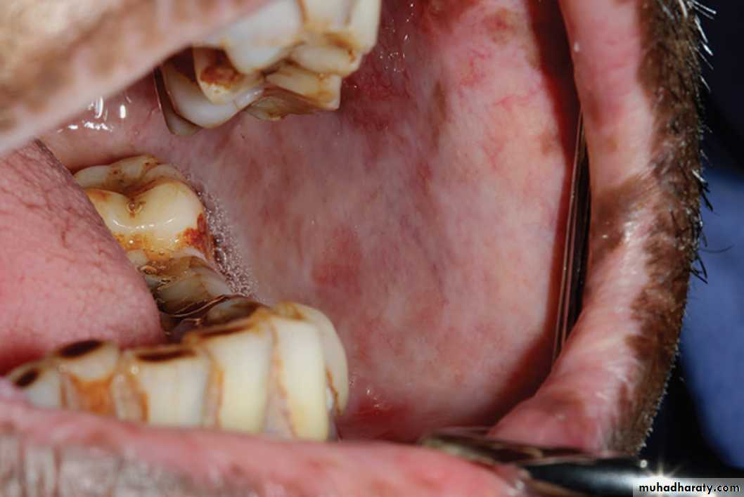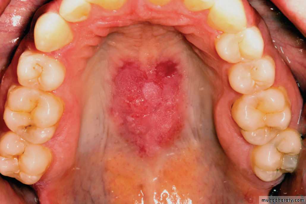 LE. Lesion showing a mixed red and white plaque involving the mid-posterior hard palate.•