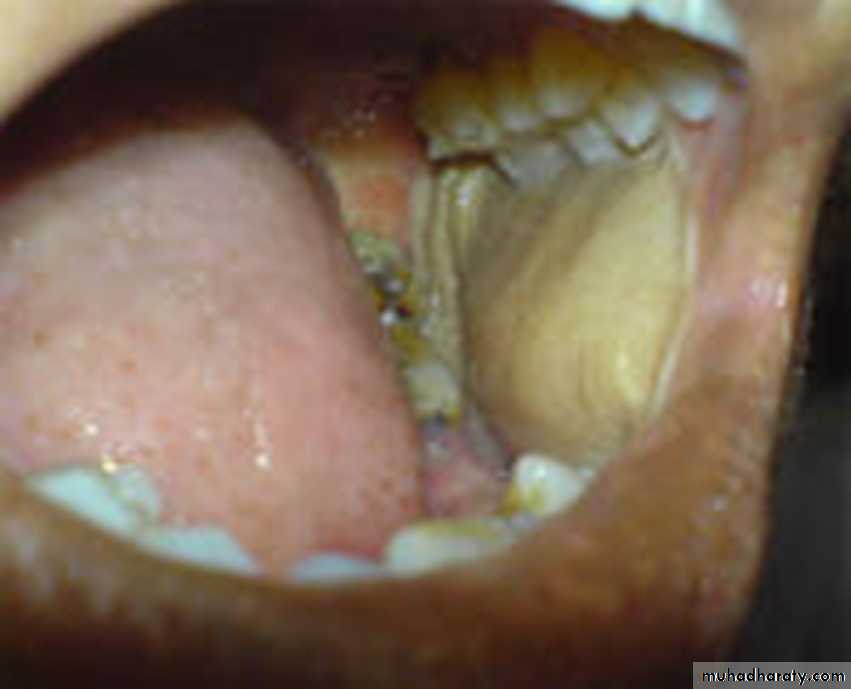 Oral Submucous Fibrosis. Same Gutkha user patient showing pallor of the left buccal mucosa.•