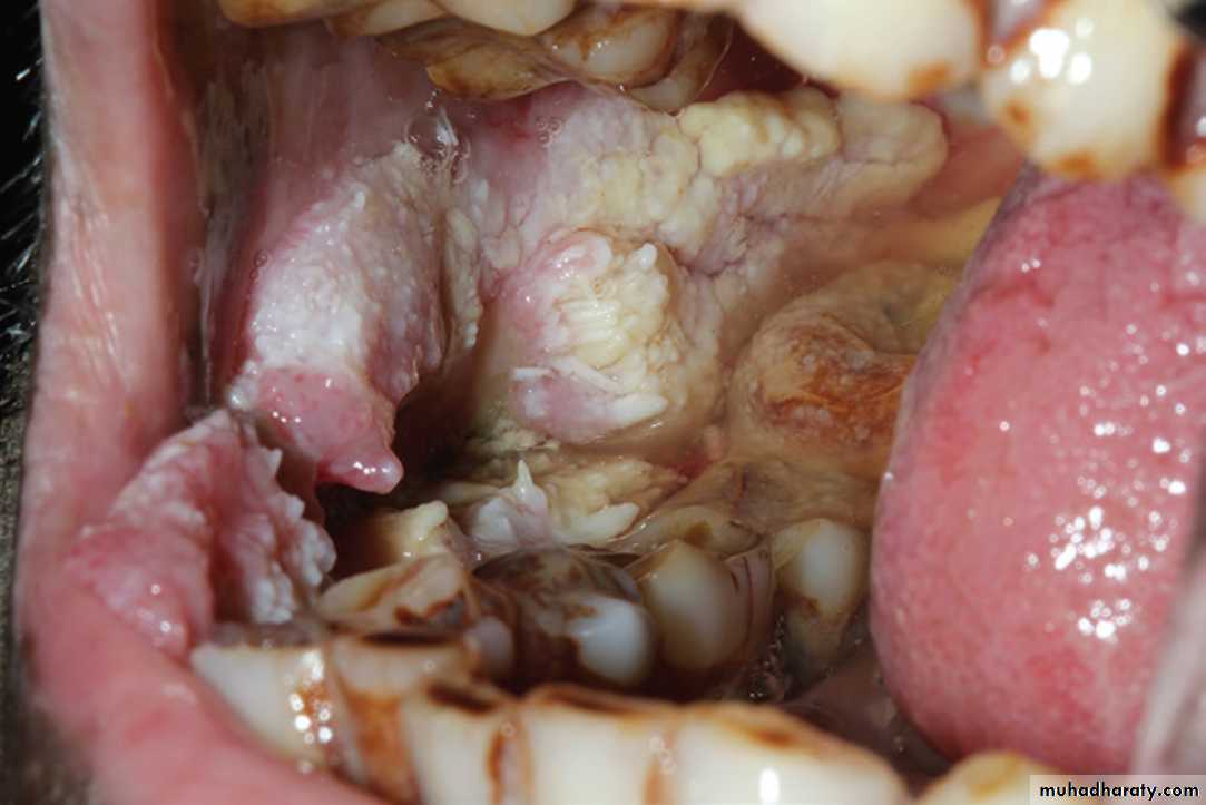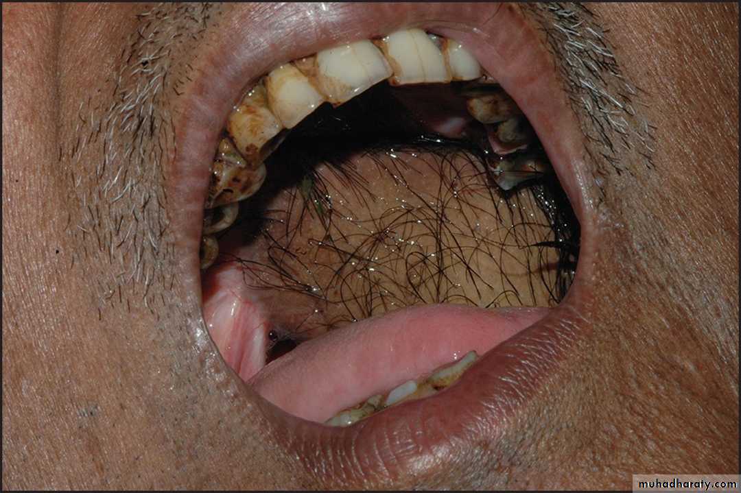 Oral Submucous Fibrosis. Same Gutkha user patient after years developed Squamous Cell Carcinoma. Extensive mass involving the right buccal mucosa and right lower labial mucosa•