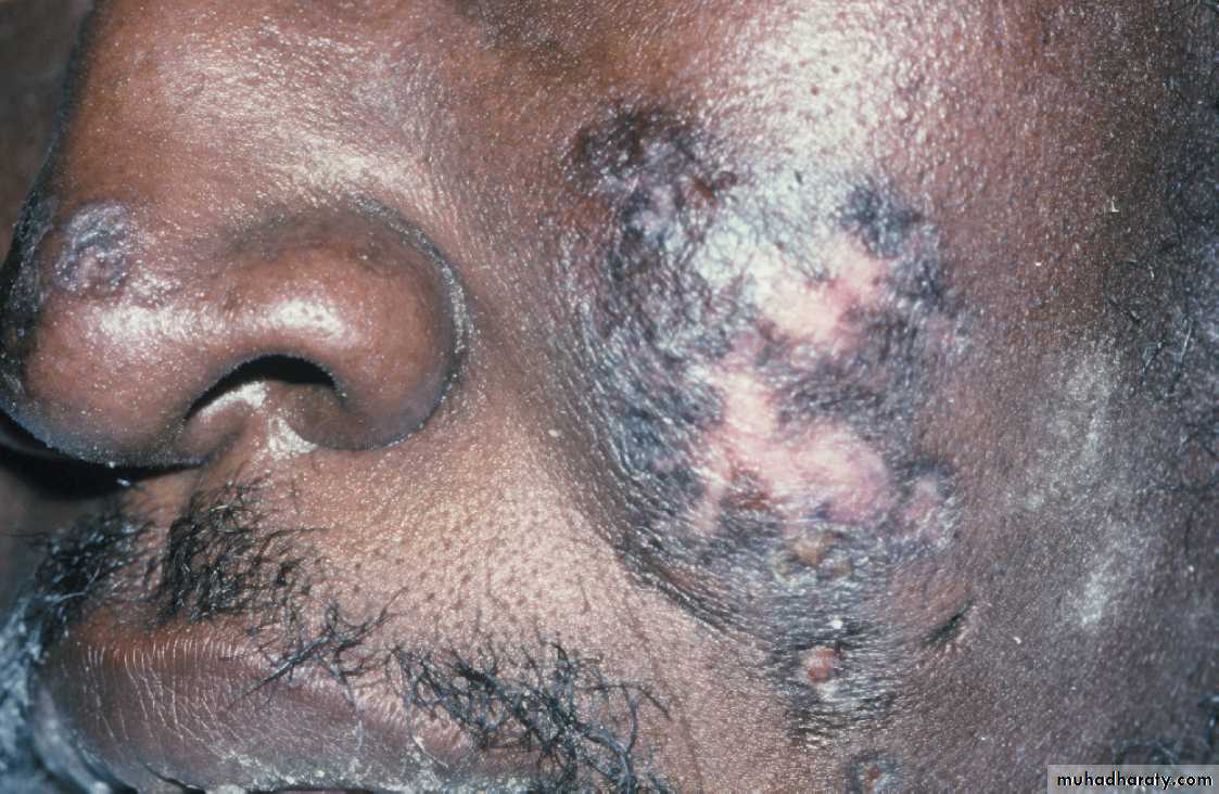 DLE. In dark skin patient. The skin lesions are characterized by scaling, atrophy, and pigmentation disturbances, which are most evident on sun-exposed skin•