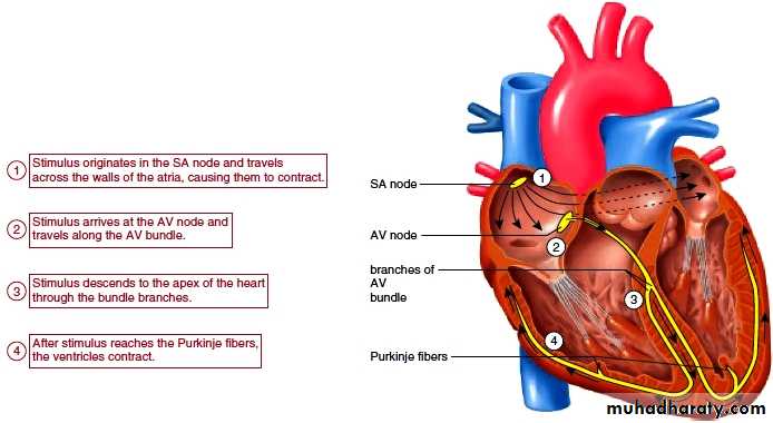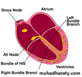 The AV bundle carry signals from atrium to the ventricles, in the ventricles the AV bundle divide into right and left bundle branch, these branches then divide into an extensive network of Purkinje fibers.4. Purkinje fibers