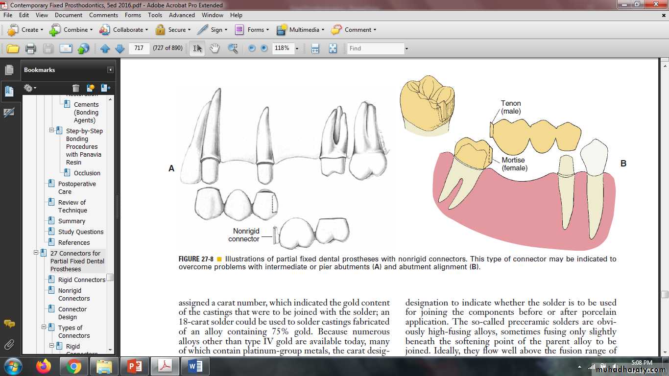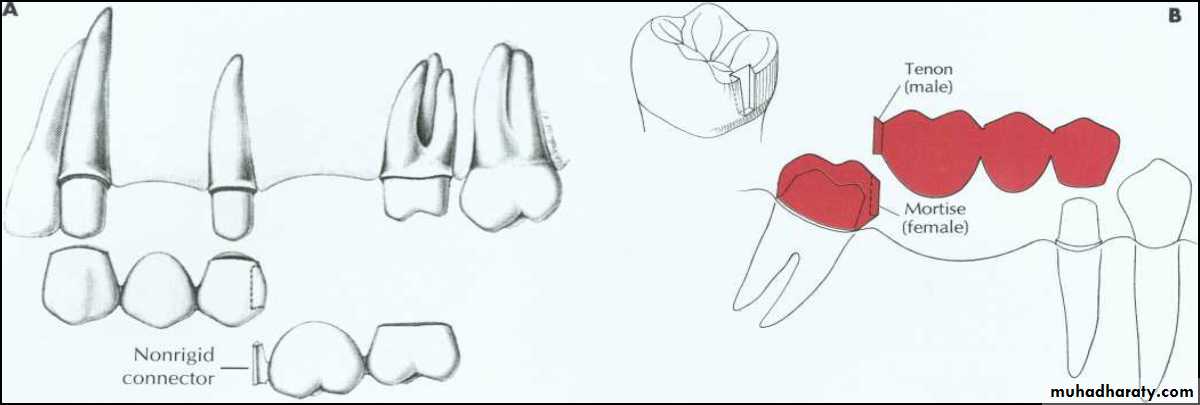 Nonrigid connectors: They are indicated when it is not possible to prepare two abutments for an FPD with a common path of placement. Segmenting the design of large, complex FPDs into shorter components that are easier to replace or repair individually is advisable.The design of nonrigid connectors that are incorporated in the wax pattern stage consists of a mortise (also referred to as the female component) prepared within the contours of the retainer and a tenon (male) attached to the pontic, The retainers are then cast separately and fitted to each other in metal.