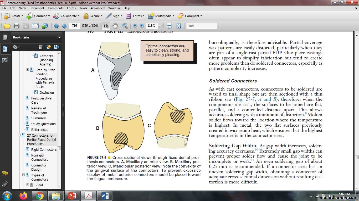 Soldered Connectors: As with cast connectors, connectors to be soldered are waxed to final shape but are then sectioned with a thin ribbon saw. therefore, when the components are cast, the surfaces to be joined will be flat, parallel, and a controlled distance apart (0.25 mm). This allows accurate soldering with a minimum of distortion. They are used if the pontics and retainers have to be made separately. This is necessary when they are made of different materials, for example a complete gold crown retainer with a metal-ceramic pontic.Soldering Gap Width: