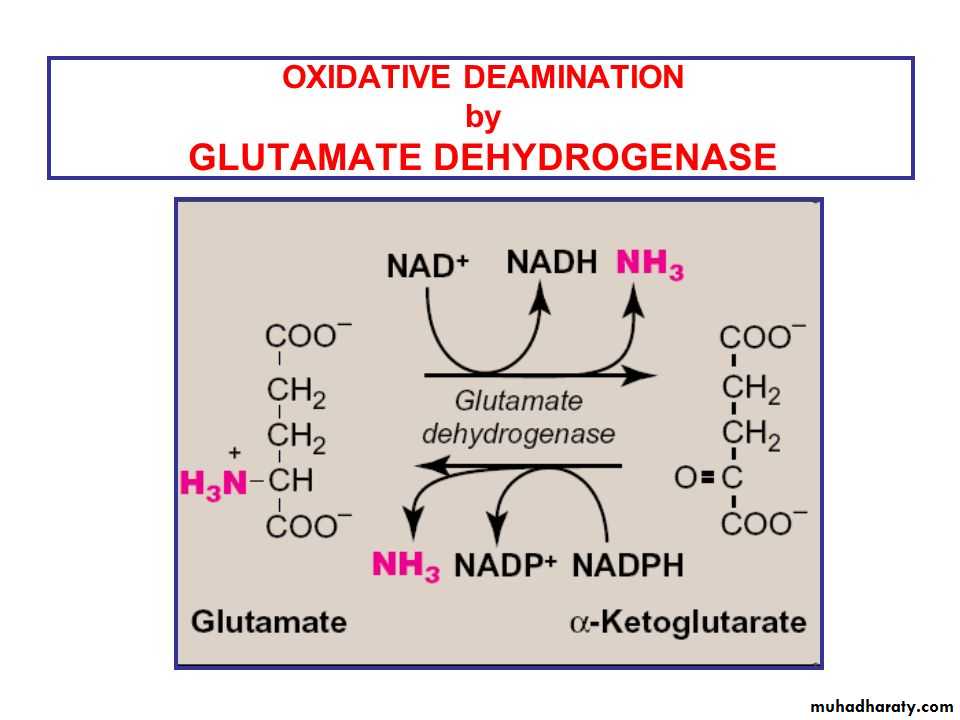 Oxidative deamination by glutamate dehydrogenase results in the liberation of the amino group as free ammonia . These reactions occur primarily in the liver and kidney. They provide α-keto acids that can enter the central pathway of energy metabolism, and ammonia, which is a source of nitrogen in urea synthesis.