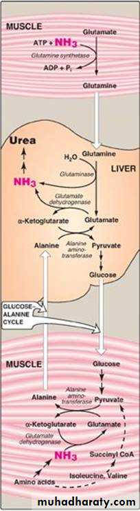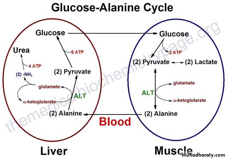 The second transport mechanism, used primarily by muscle, involves transamination of pyruvate (the end product of aerobic glycolysis) to form alanine . Alanine is transported by the blood to the liver, where it is converted to pyruvate, again by transamination. In the liver, the pathway of gluconeogenesis can use the pyruvate to synthesize glucose, which can enter the blood and be used by muscle—a pathway called the glucose-alanine cycle.