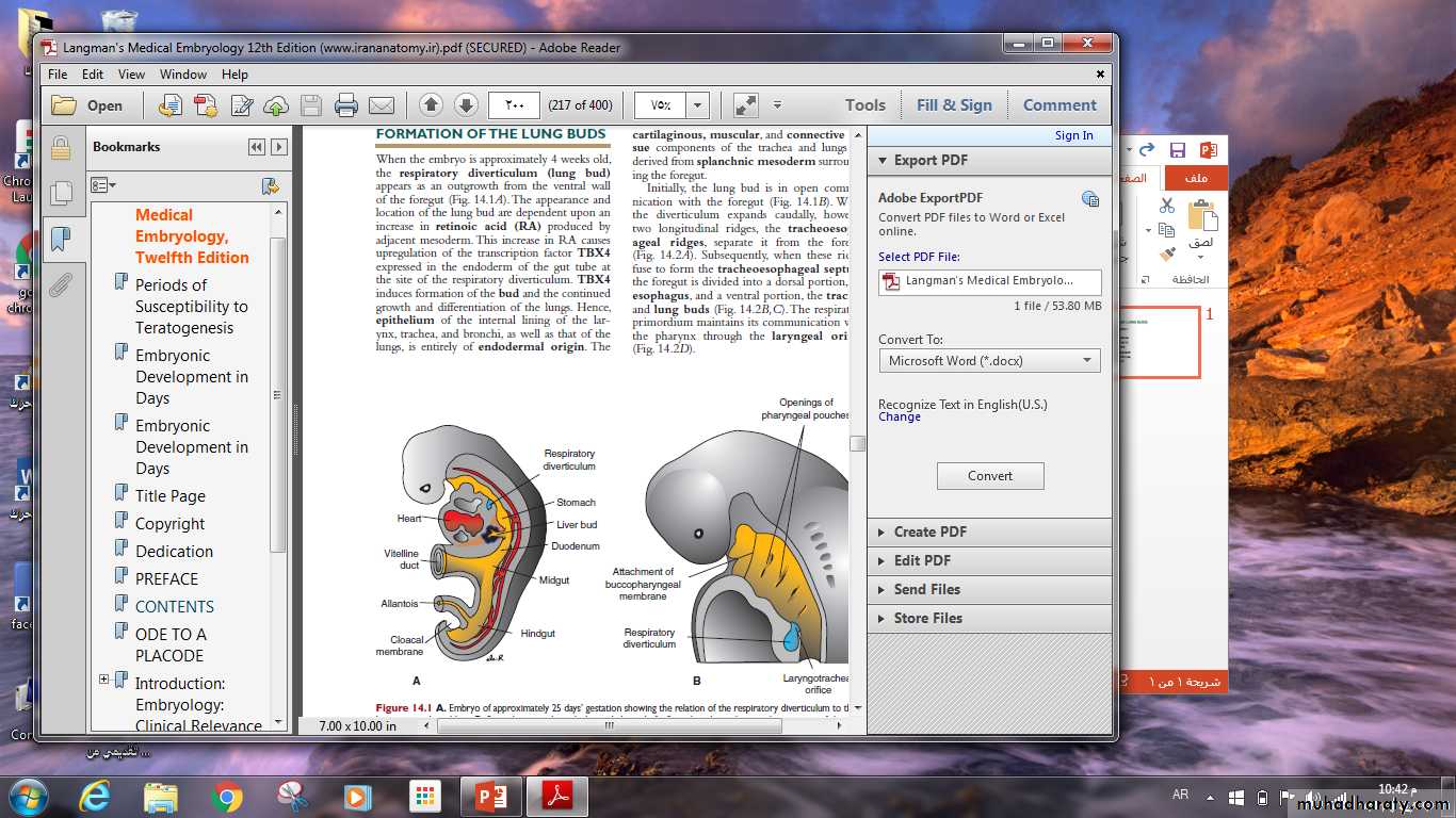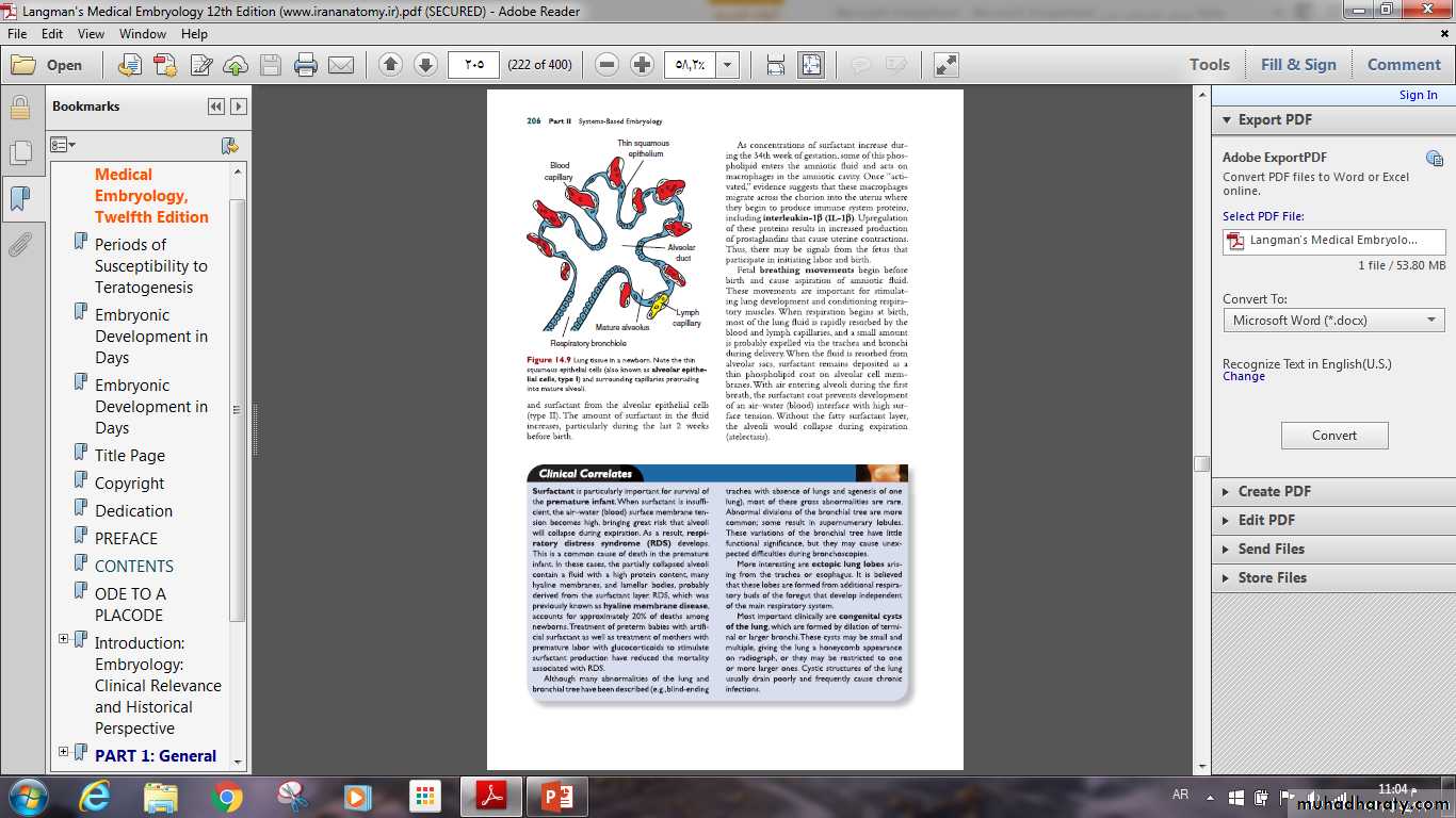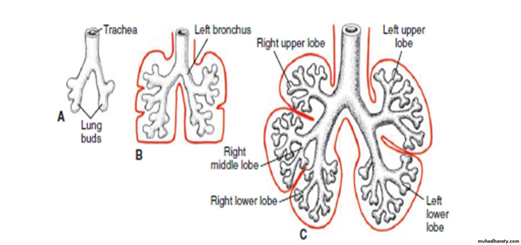 At the beginning of the fifth week ,each of these lung buds enlarges to form right and left main bronchi .The right then forms three secondary bronchi, and the left ,two secondary bronchi.The mesoderm, which covers the outside of the lung develops into the visceral pleura. The somatic mesoderm layer, covering the body wall from the inside, becomes the parietal pleura . The space between the parietal and visceral pleura is the pleural cavity.