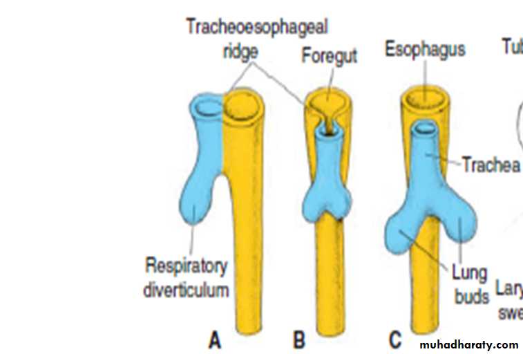 When the diverticulum expands caudally, however, two longitudinal ridges, the tracheoesophageal ridges, separate it from the foregut. Subsequently, when these ridges fuse to form the tracheoesophageal septum, the foregut is divided into a dorsal portion, the esophagus, and a ventral portion, the trachea and lung buds.