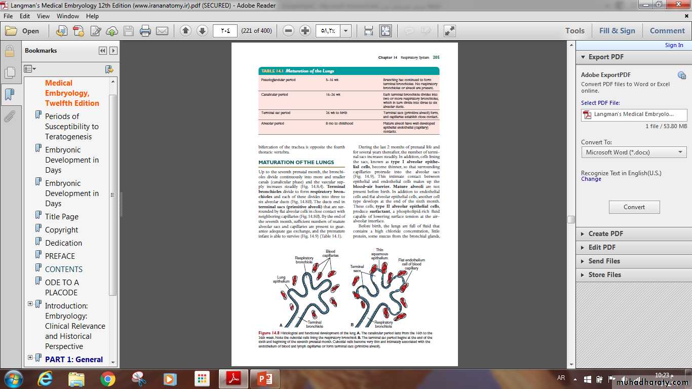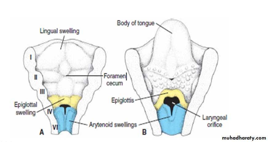 The internal lining of the larynx originates from the endoderm ,but the cartilages and muscles originate from mesenchyme of the fourth and sixth pharyngeal arches. As a result of rapid proliferation of this mesenchyme, the laryngeal orifice changes in appearance from a sagittal slit to a T-shaped opening. The laryngeal ventricles are bounded by folds of tissue that differentiate into the false and true vocal cord. All laryngeal muscles are innervated by branches of the tenth cranial nerve ,the vagus nerve.Trachea , Bronchi, and Lungs