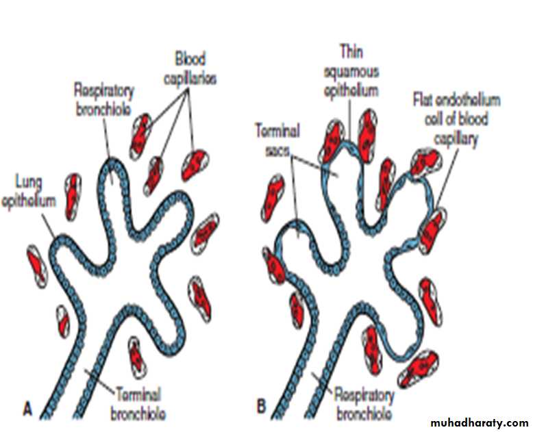 During the last 2 months of prenatal life and for several years thereafter, the number of terminal sacs increases steadily. In addition, cells lining the sacs, known as type I alveolar epithelial cells, capillaries protrude into the alveolar sacs become thinner, so that surrounding capillaries protrude into the alveolar sacs.