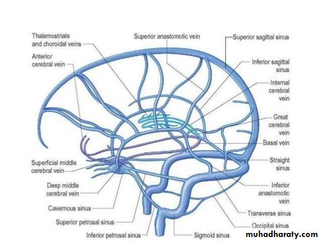• The sigmoid sinuses - leave through jugular foramen --►internal jugular vein.