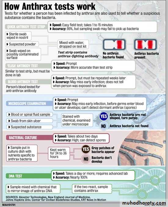 Tests for AnthraxAntibody testsQuick antibody test stripsELISA testBlood testMicroscopic analysisCulture (Blood& exudates)DNA test – PCREnvironmental samplesSwabsWipes