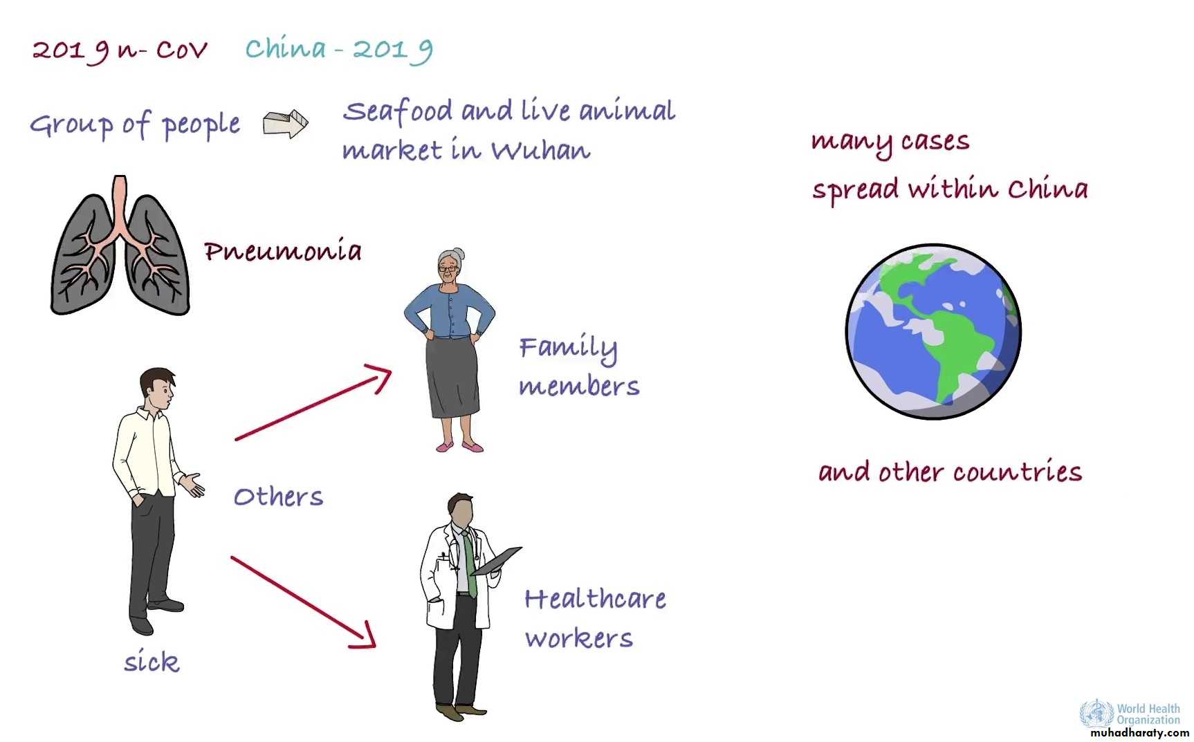 It initially occurred in a group of people with pneumonia who had been associated with a seafood and live animal market, in the city of Wuhan. The disease has since spread from those who were sick to others including family members and health care staff. There are many cases at present, and the disease has spread within China and also to a number of other countries.