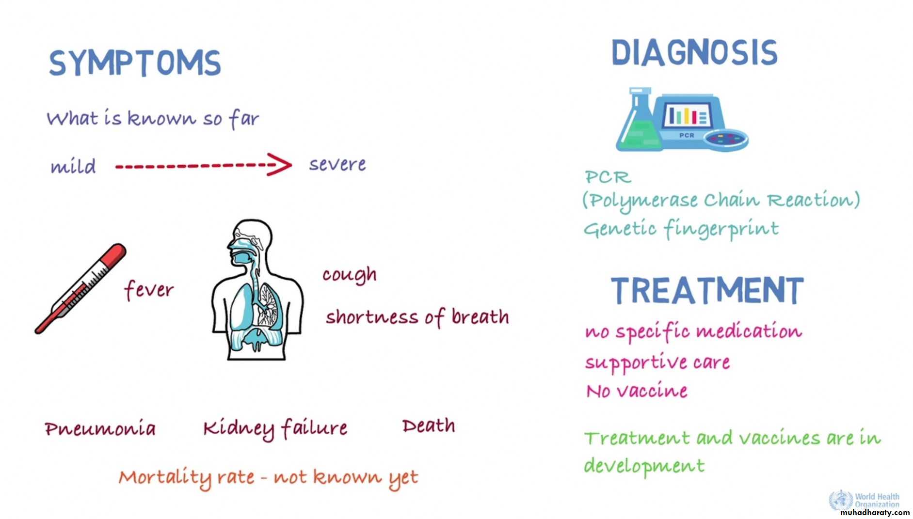 So how does the disease present? there can be a number of symptoms ranging from mild to severe. There can be fever and respiratory symptoms such as cough and shortness of breath. In more severe cases, there has been pneumonia, kidney failure and death. The mortality rate is not known yet. How can we tell whether someone is infected? The infection can be diagnosed by a test called PCR, or Polymerase Chain Reaction. This test identifies the virus based on its genetic fingerprint. There is currently no specific medication for this virus and treatment is supportive care. There is currently no vaccine to protect against this virus. Treatment and vaccines are in development.
