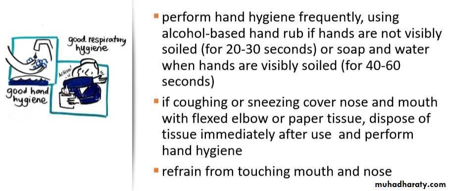 • Washing hands regularly with soap and water or alcohol-based hand rub.