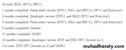 • Child Age Vaccine• -End of 1st week ------BCG+OPV0+HBV1