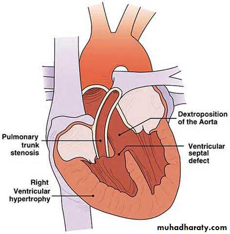 Morphology:- The heart is enlarged externally by right ventricular hypertrophy, the proximal aorta is larger than pulmonary trunk, so that because of stenotic pulmonary artery, this will lead to shunt unoxygenated blood from right ventricle through VSD to go to left ventricle and aorta.