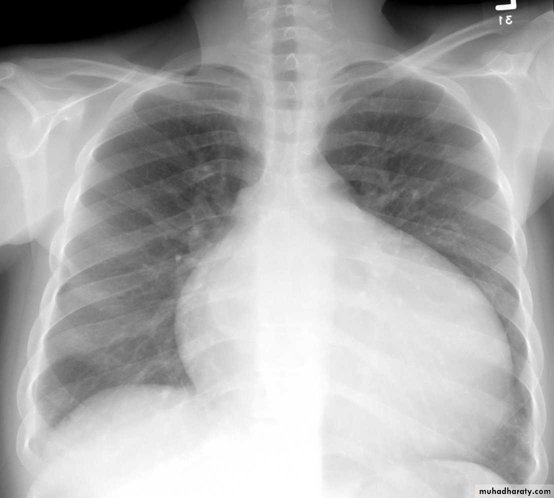 The proximal pulmonary arteries are also dilated with development of pulmonary hypertension and cause right ventricular hypertrophy and dilation and right atrial dilation.